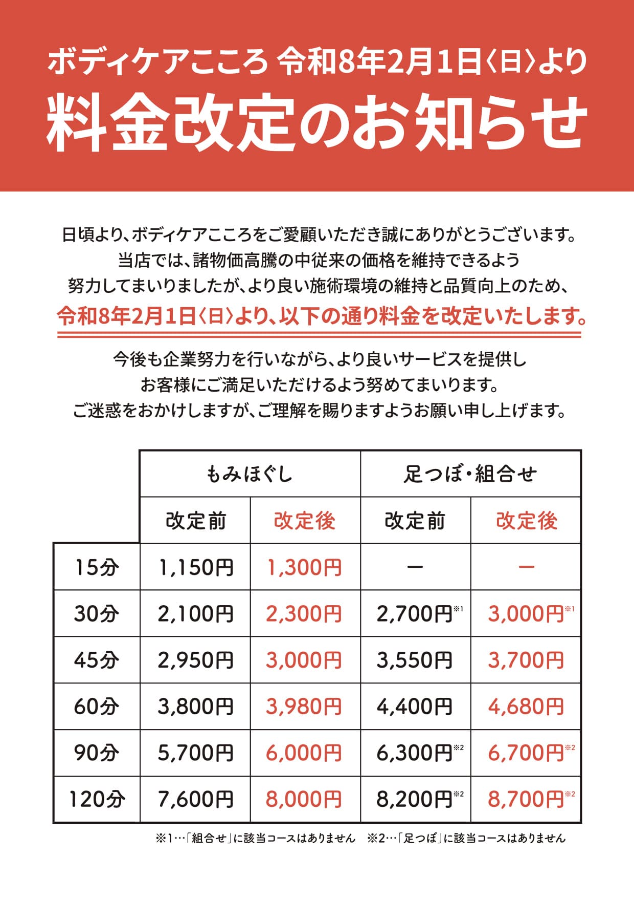 ボディケアこころ料金変更のお知らせ